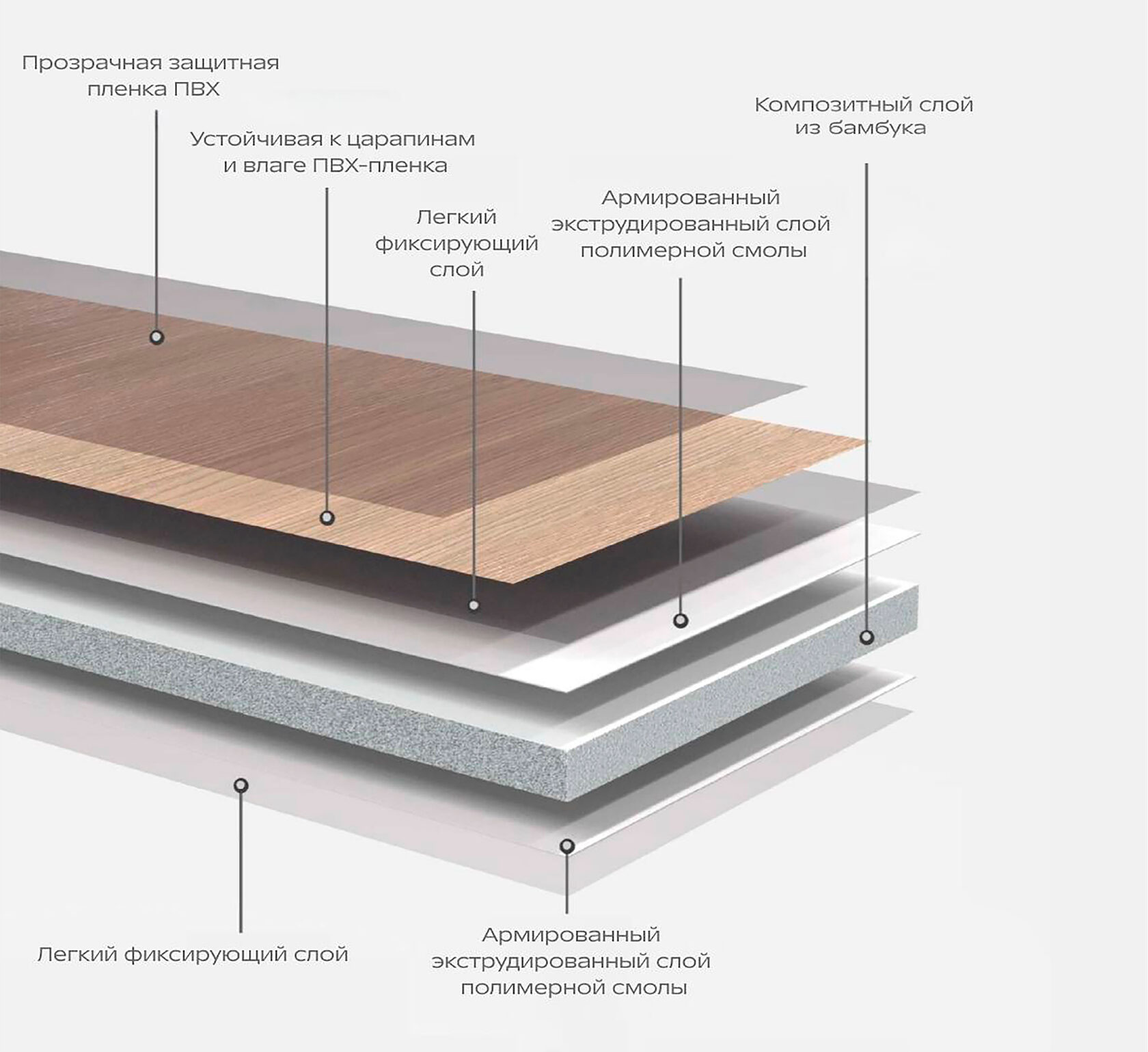 | Cостав панелей Композитный слой из бамбука придает ей повышенную устойчивость к внешним воздействиям и долговечность. Прозрачная защитная пленка ПВХ защищает панель от внешних воздействий, царапин и влаги, сохраняя её привлекательный внешний вид на протяжении всего срока службы. Армированный слой полимерной смолы играет роль усилителя, придавая панелям дополнительную прочность. Он помогает панели сохранять свою форму и структуру. Легкий фиксирующий слой надежно закрепляет все компоненты панели, не добавляя лишнего веса и обеспечивая простоту в монтаже. |